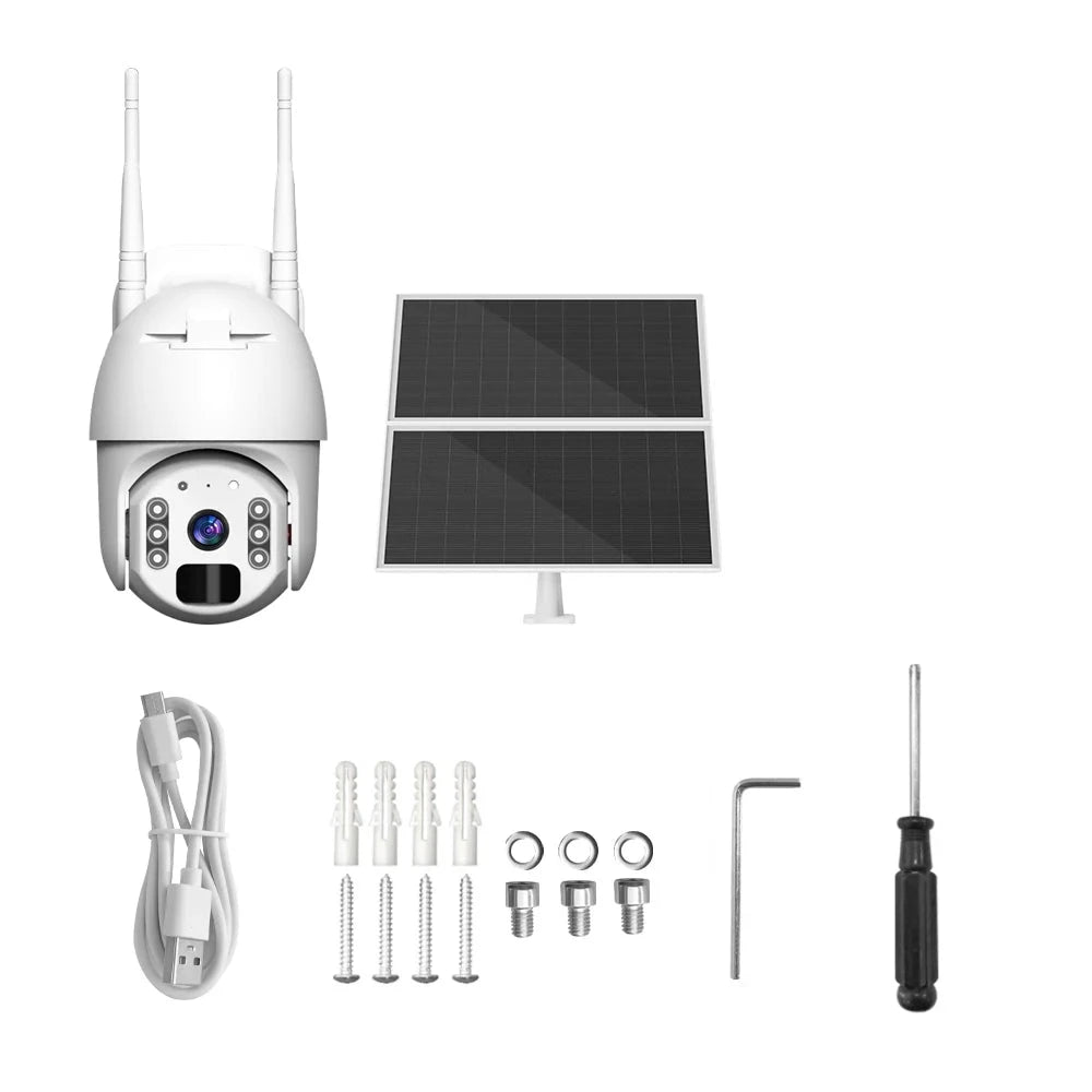 Cette caméra solaire extérieure est équipée d’une batterie intégrée, offrant une surveillance sans fil avec vision nocturne et une étanchéité IP65, idéale pour toutes les conditions météorologiques. Contrôlable via l'application "ubox", elle permet une rotation horizontale de 355° et verticale de 90° pour une couverture optimale. Avec un emplacement pour carte TF et la possibilité d'enregistrement cloud, elle assure une sécurité complète et flexible.